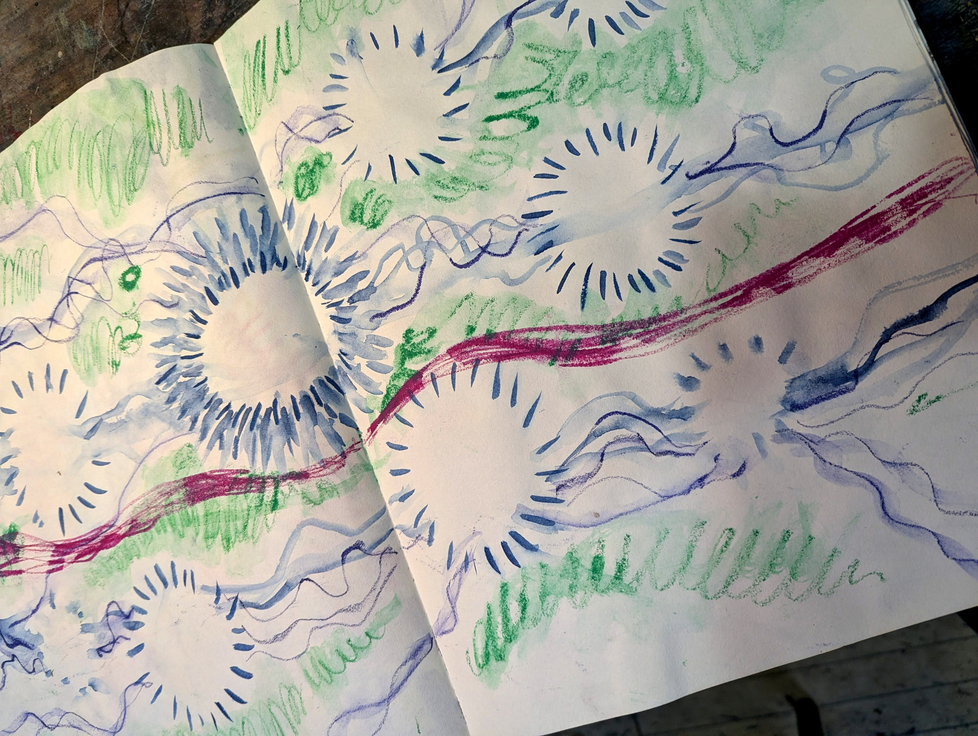 Integrative Arts Psychotherapy–informed techniques (not therapy): move themes across drawing, movement, mark-making, image, and text, like turning a crystal and catching new facets of light.